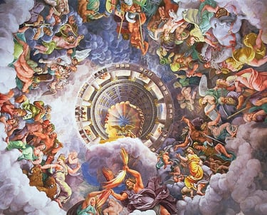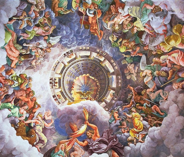 Deuses do Olimpo, 1534-35, Giulio Romano. O tambor "lanterna" acima da cúpula é uma ilusão de ótica pintada.